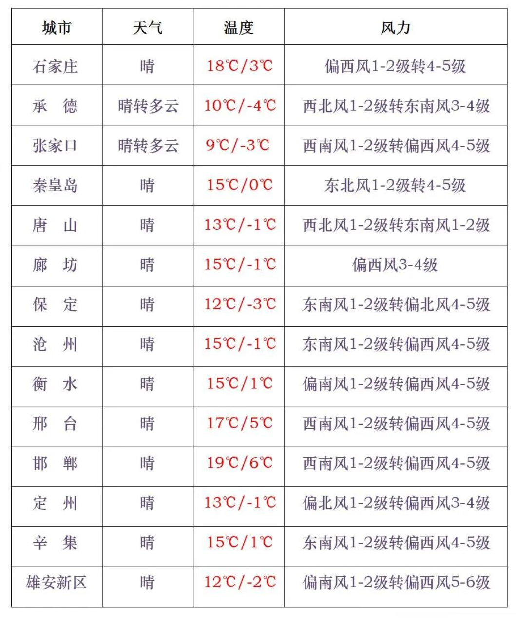 今天白天,张家口北部、承德北部多云,其他地区晴。张家口、承德北部和保定、石家庄、邢台、邯郸四个地区的西部山区有西到西北风4到6级,阵风7到8级,局地可达9级以上。请注意防范。