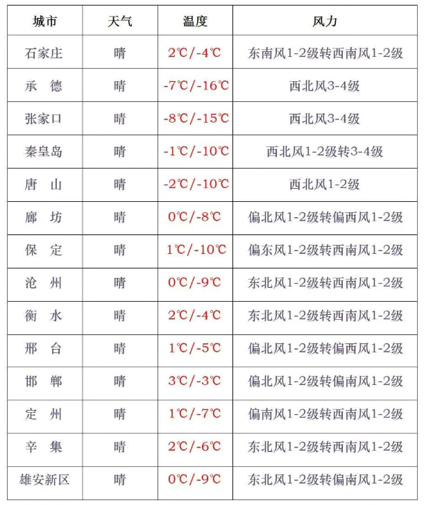 今天白天,全省晴间多云。今天早晨,最低气温张家口北部、承德北部降至-30~-19℃。今天夜间到明天,渤海海域和沿海地区有西北风5到6级,阵风7到9级。