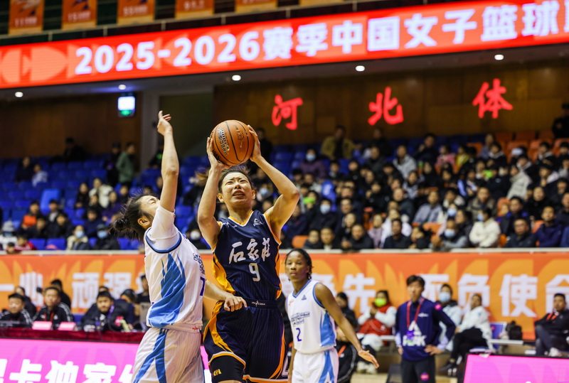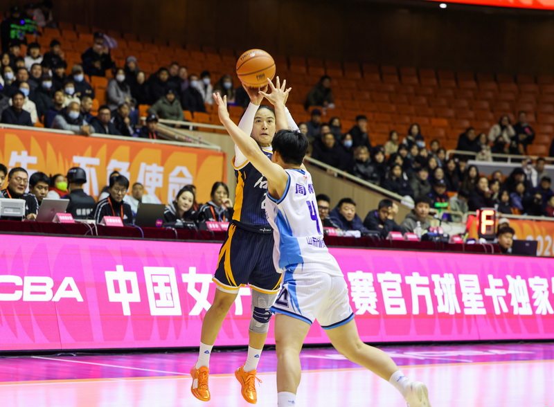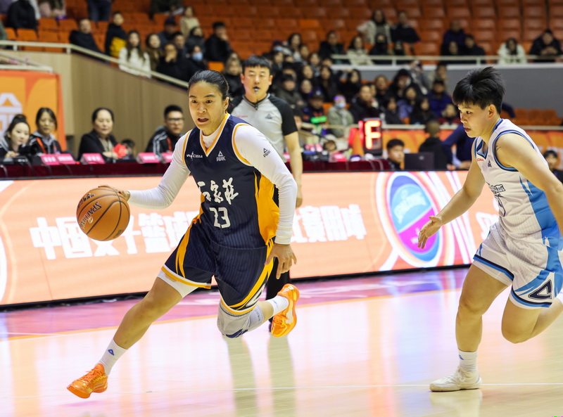 12月2日,石家庄英励女篮23号王丽丽(左)在比赛中。