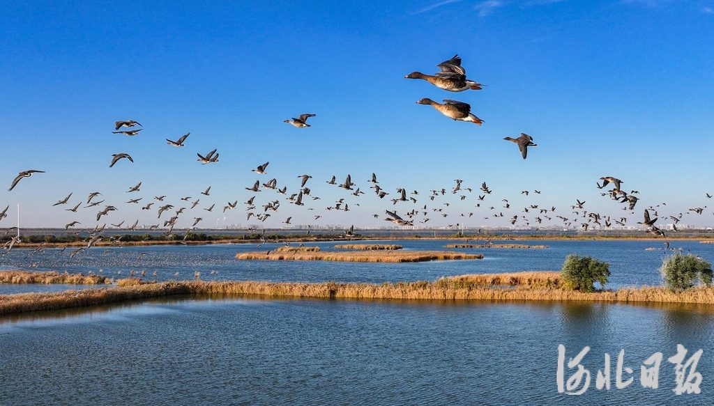 衡水湖国家级自然保护区是东亚—澳大利西亚候鸟迁徙路线上的重要驿站。每年入冬,便会迎来数万只远道而来的候鸟,在此停歇越冬。“你看,大批的鸿雁、豆雁都来了,这说明衡水湖已经进入了候鸟迁徙高峰期。”湖面上,快艇划过,留下一道长长的白色弧线。衡水滨湖新区综合管理局执法队副队长孙丙言手持望远镜,时而望向远方,时而在本上记录。