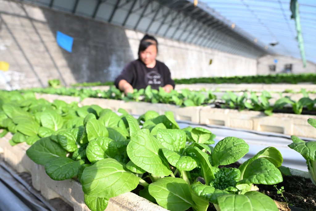 12月7日,在永清县海泽田现代农业园区,农户正在管护基质栽培架上的绿色蔬菜。