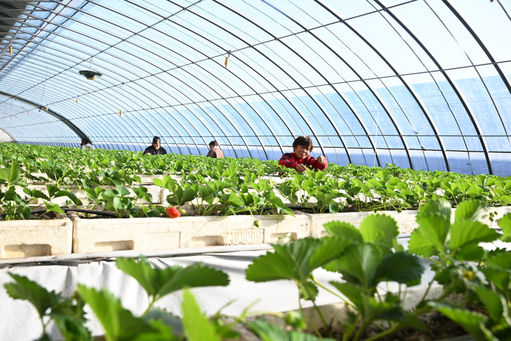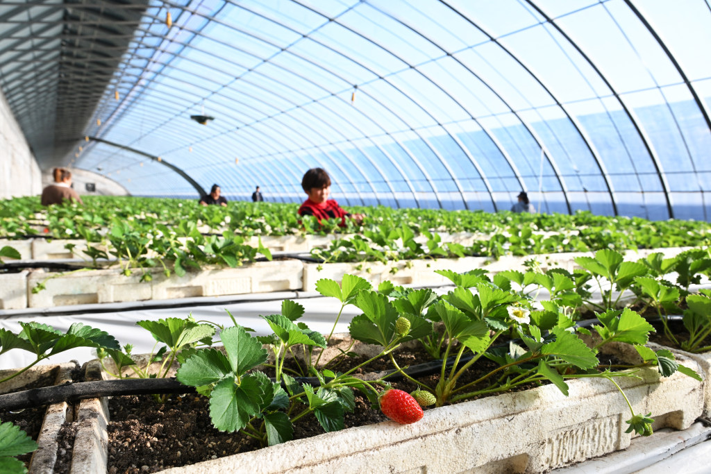 12月7日,在永清县海泽田现代农业园区,农户正在管护基质栽培架上的草莓。