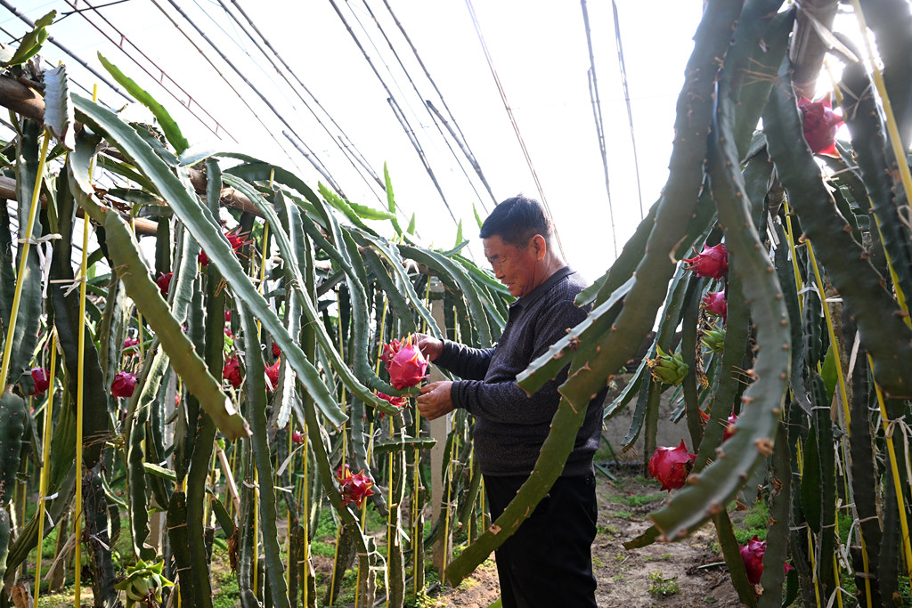 12月7日,在永清县海泽田现代农业园区,农户正在管护火龙果。