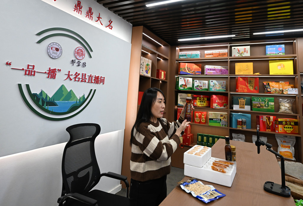 11月12日,在大名“一品一播”产业园电商孵化中心,主播在直播售卖大名土特产品。