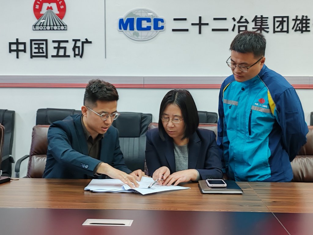 日前,崔文杰(左一)来到二十二冶集团雄安发展有限公司,与企业技术总监赵春梅(中)探讨企业与高校共建联合实验室方案。河北日报见习记者 康晓博 摄