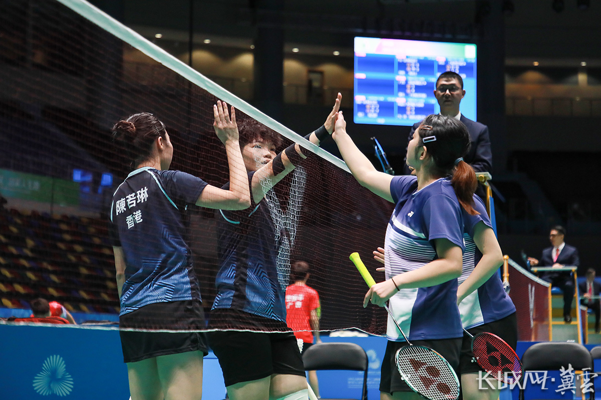 ▲12月13日,全国残特奥会羽毛球WH1-WH2女子双打比赛中,河北运动员与香港运动员击掌致意。长城网·冀云客户端记者 李皓 摄
