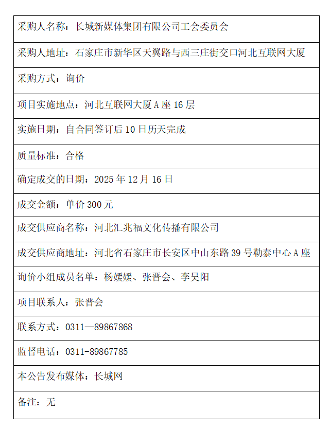 长城新媒体集团有限公司《问政会客厅》精品栏目全媒体传播推广项目采购成交结果公告
