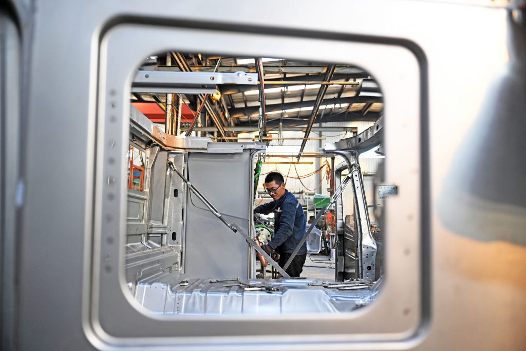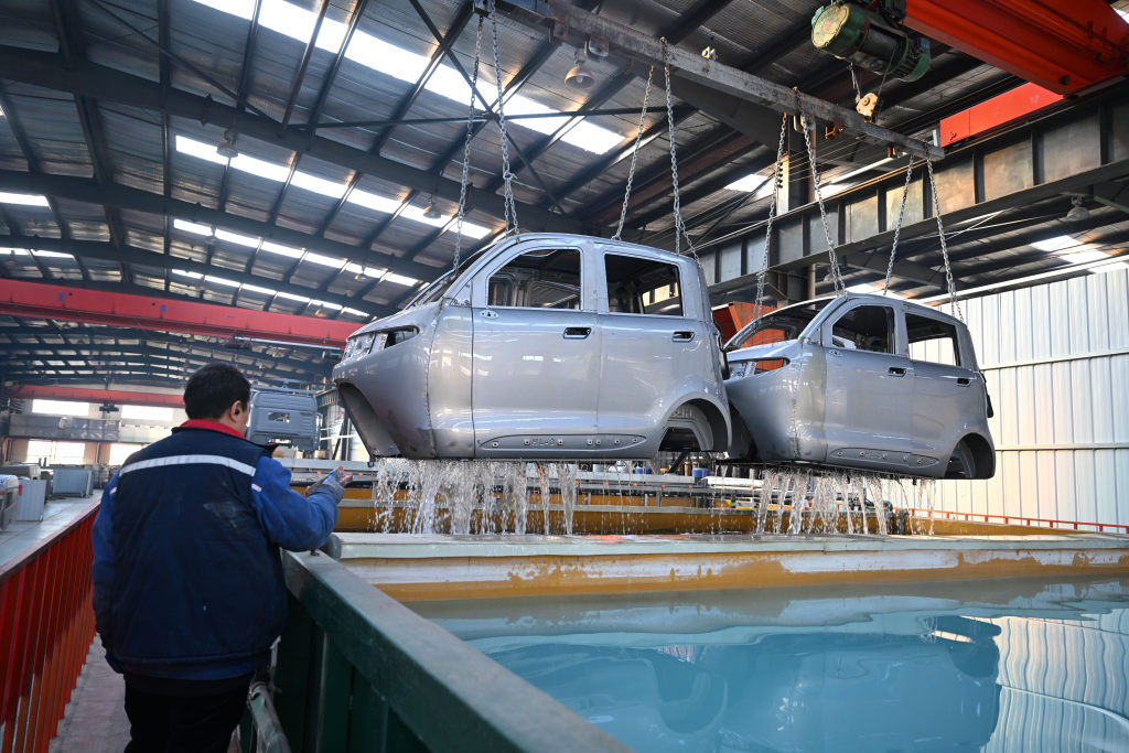 12月8日,霸州市明月汽车配件厂工人在电泳车间涂装新能源汽车车身。