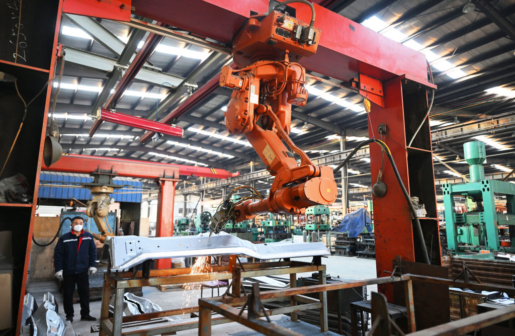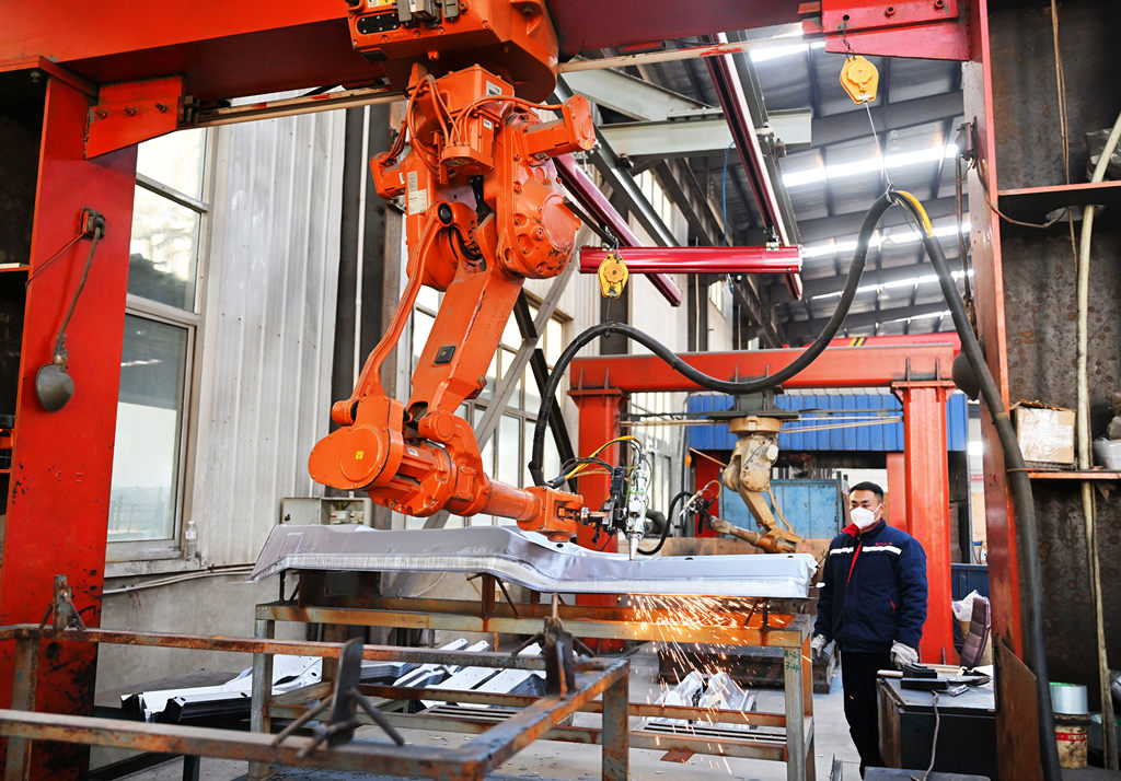 12月8日,在霸州市明月汽车配件厂,全自动激光切割机器人正加工汽车零部件。