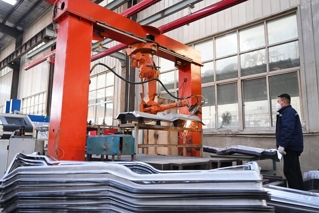 12月8日,霸州市明月汽车配件厂工人在利用柔性自动折边机加工汽车零部件。