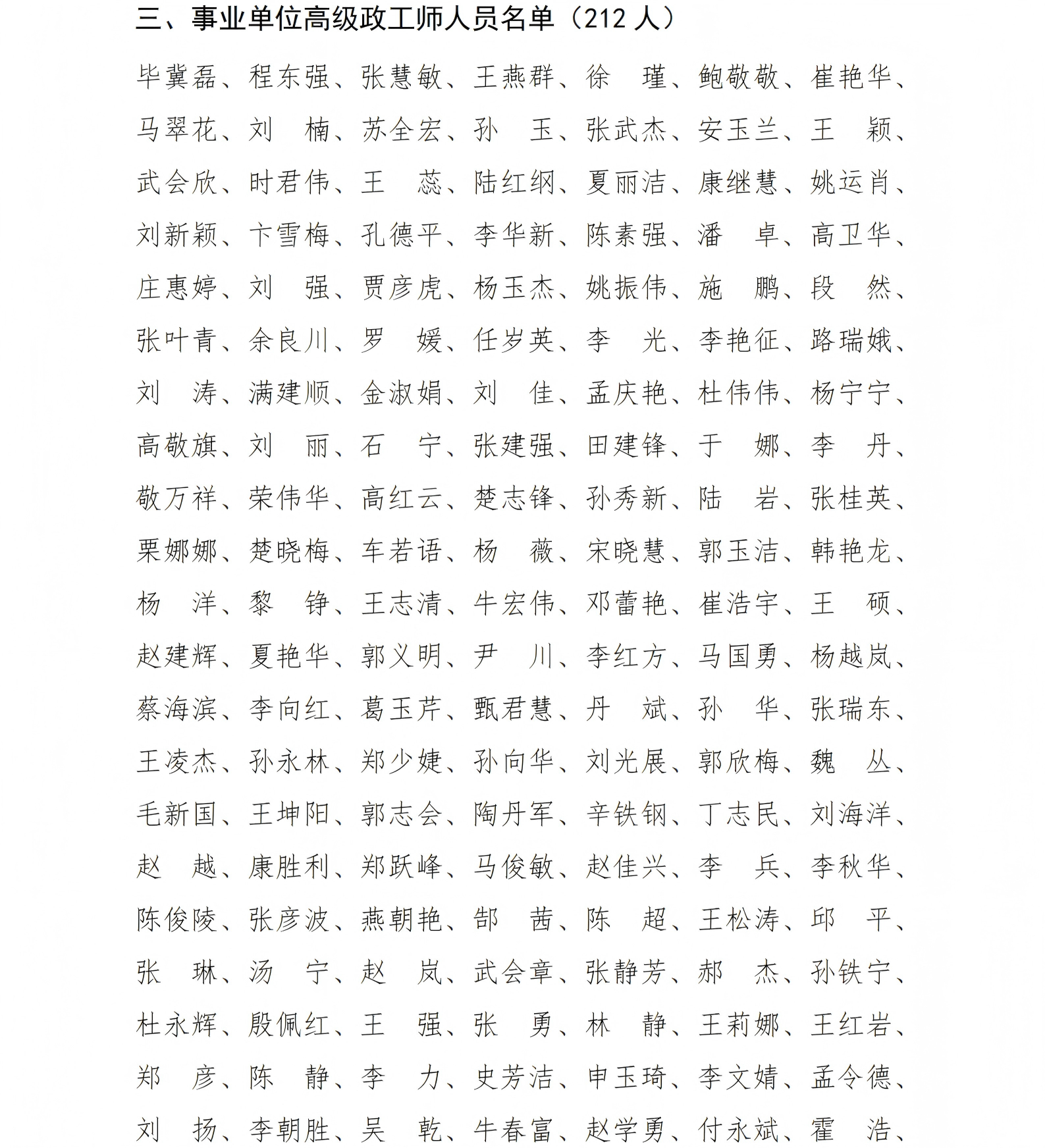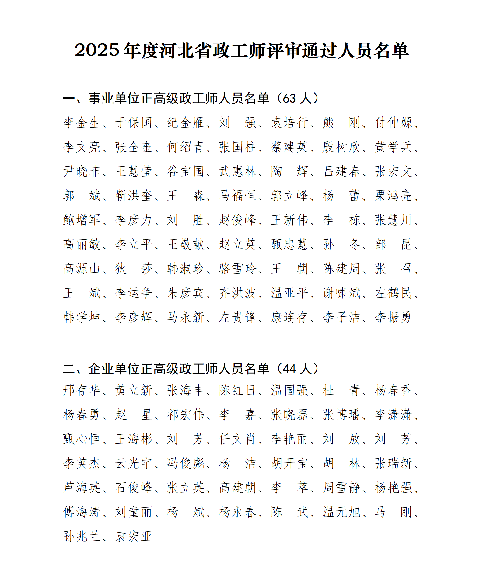 按照《河北省政工专业职务评定办法》和《关于在全省事业单位试行思想政治工作专业职务评聘工作的通知》有关要求,省政工职评办组织专家对全省参评2025年度正高级政工师、高级政工师和省属高校中级政工师、初级政工师人员进行了集中评审,现将评审结果公示。