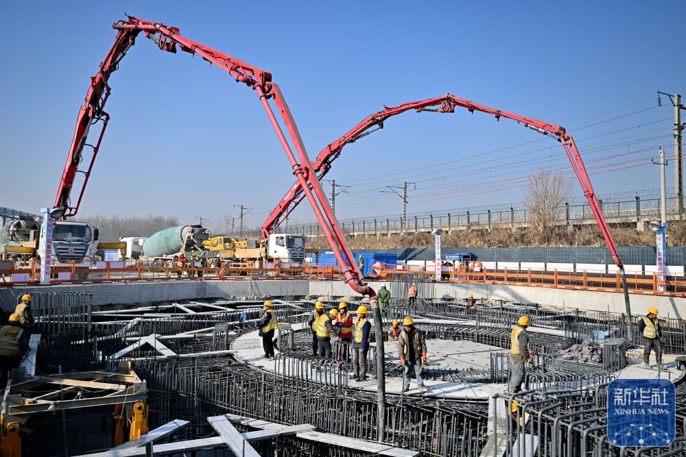 ↑ 12月23日,中铁十一局工人在石雄铁路跨朔黄铁路特大桥176号墩转体桥承台浇筑现场作业。