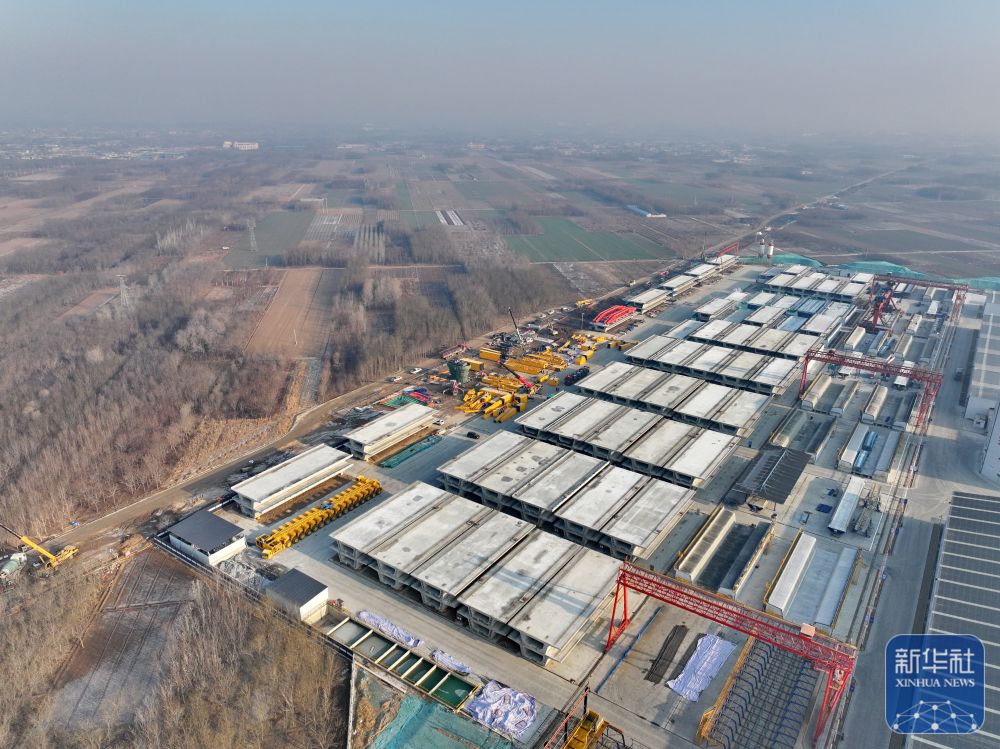 ↑ 这是中铁十一局石雄铁路2标段安国制梁场(12月23日摄,无人机照片)。