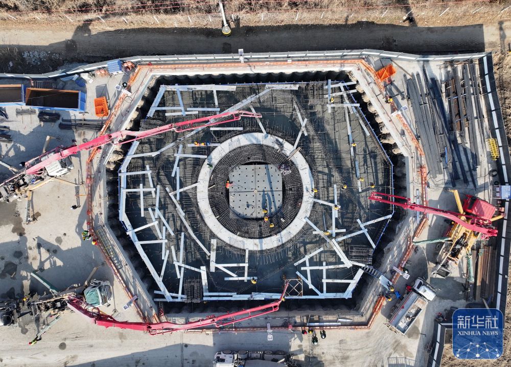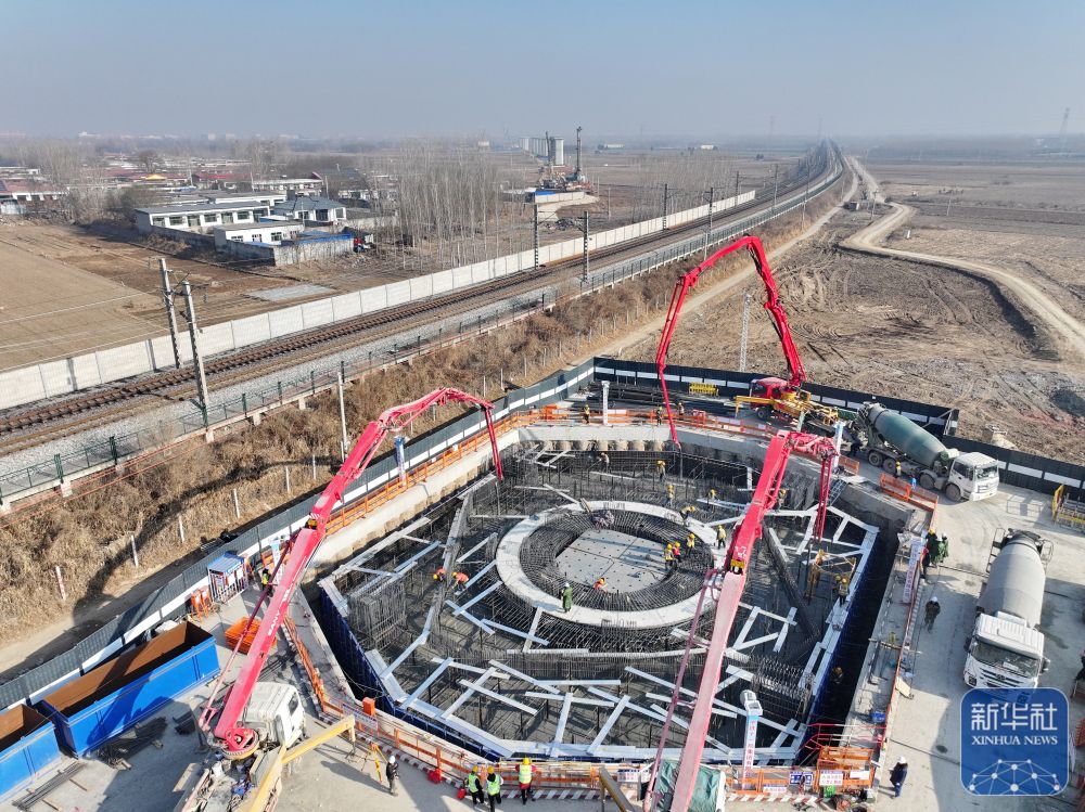 ↑ 这是石雄铁路跨朔黄铁路特大桥176号墩转体桥承台浇筑现场(12月23日摄,无人机照片)。