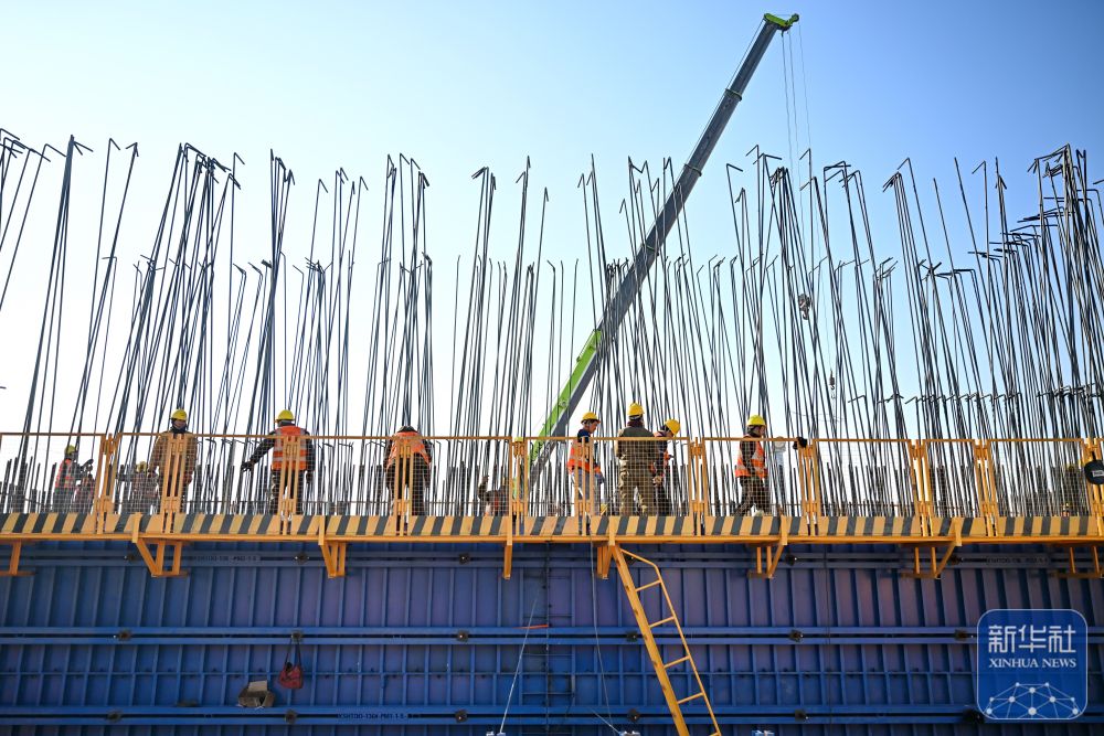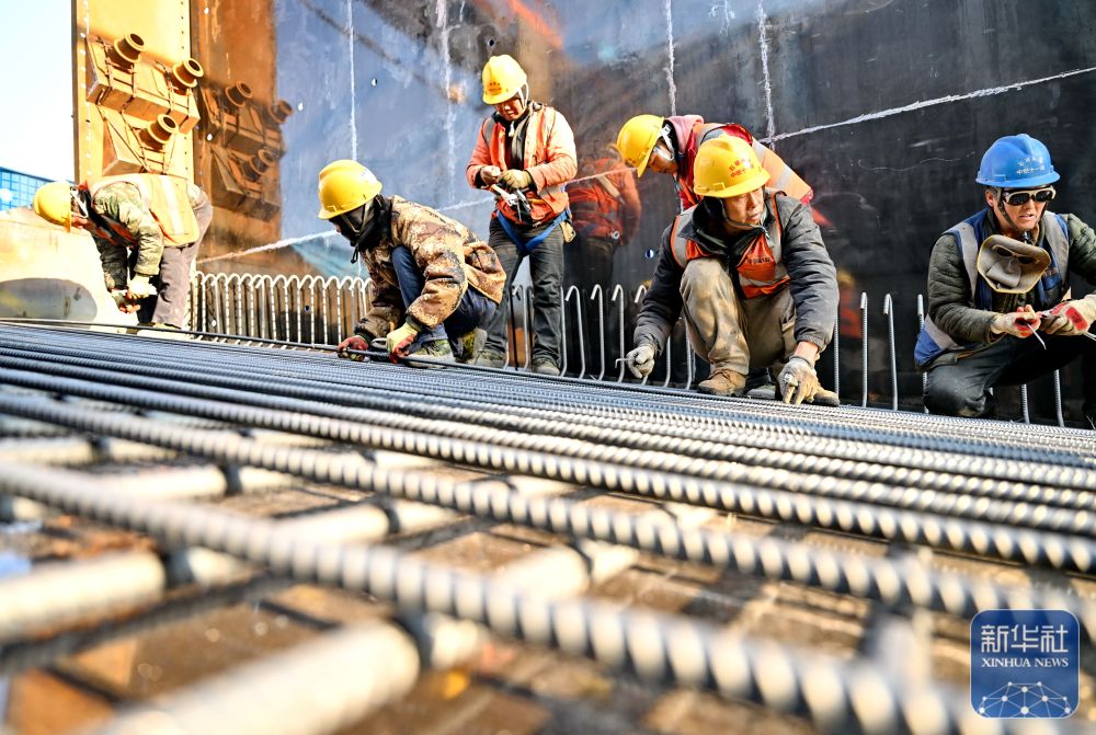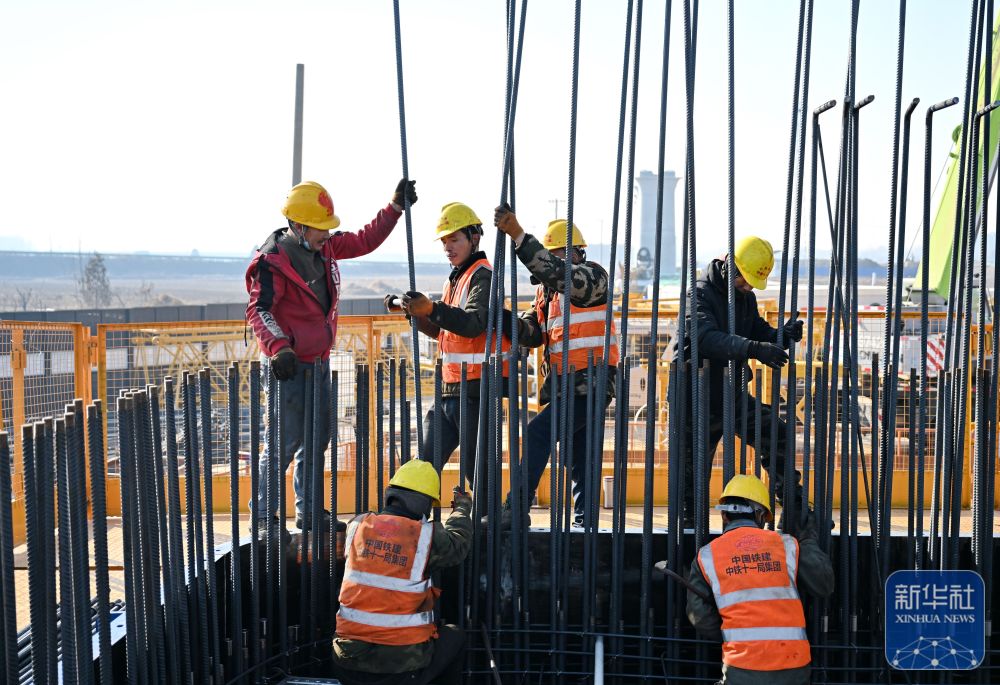 ↑ 12月23日,中铁十一局工人在石雄铁路跨津石高速连续梁拱主墩建设现场架设钢筋。