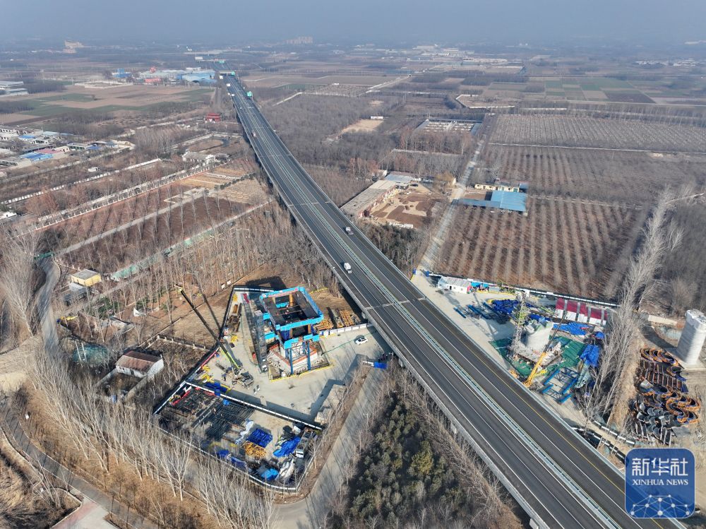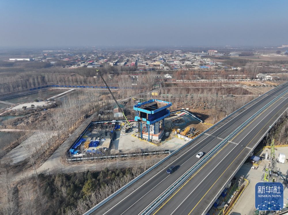 ↑ 这是石雄铁路跨曲港高速转体连续梁主墩建设现场(12月23日摄,无人机照片)。