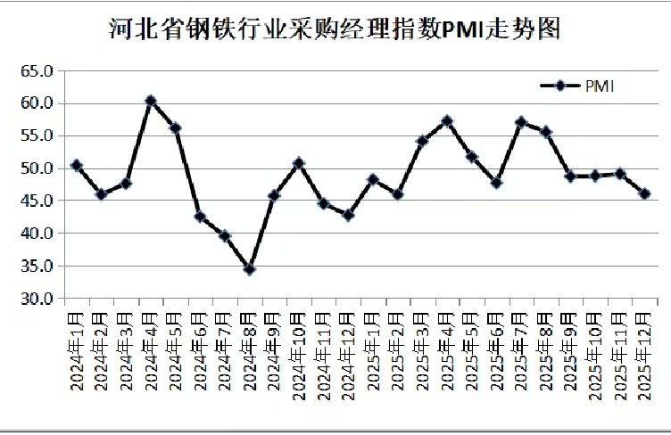 2026年1月1日,河北省冶金行业协会发布2025年12月份全省钢铁行业PMI为46.0%,环比下降3.1个百分点,仍处于荣枯线以下。