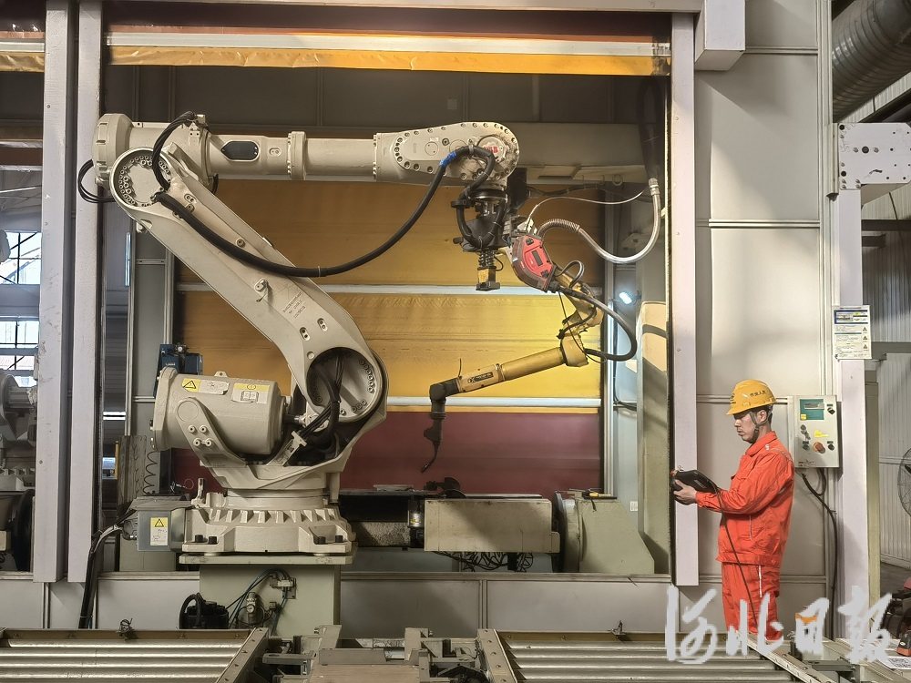 1月6日,在中铁山桥道岔垫板智能生产线上,工人正在给焊接机械臂输入加工数据。河北日报记者孙也达摄