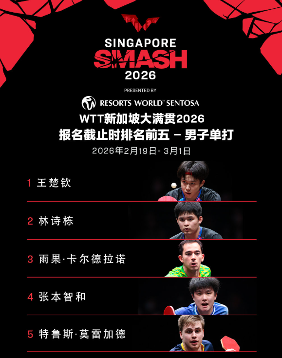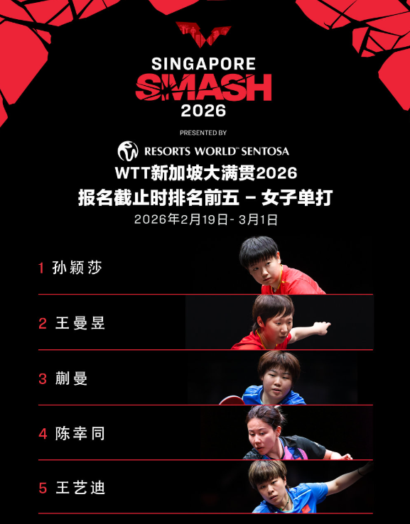WTT新加坡大满贯2026将于2月19日至3月1日在新加坡体育中心举行。WTT世界乒联公布首批参赛名单。