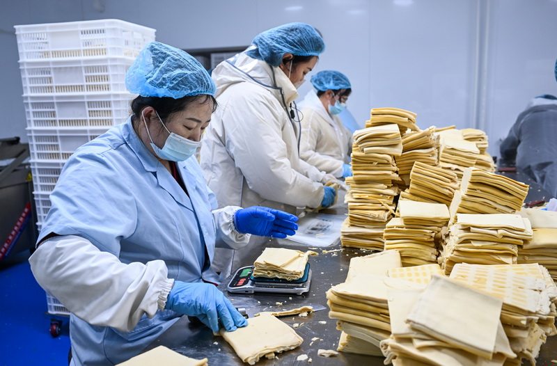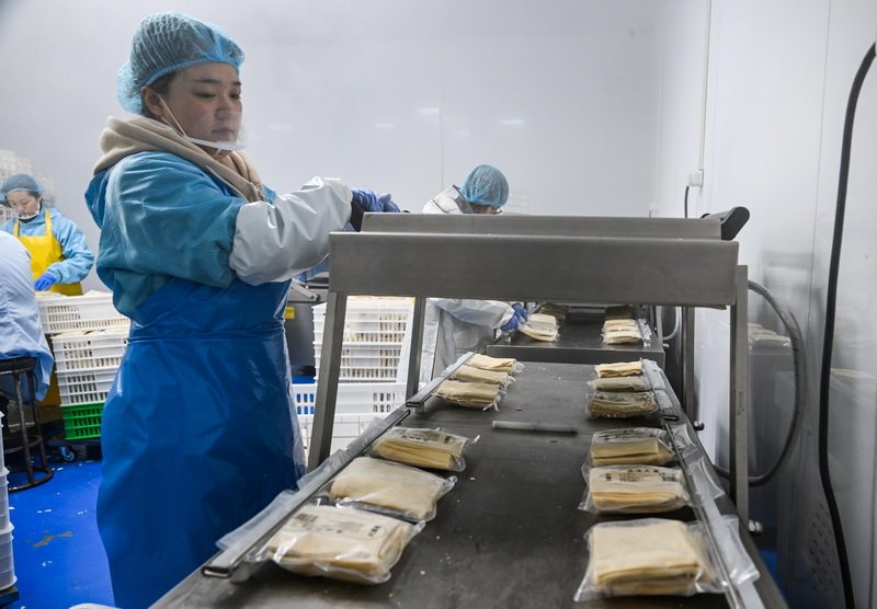1月11日,怀安豆韵食品有限公司员工在进行豆制品称重包装。