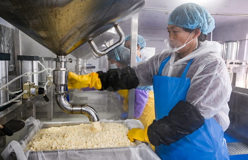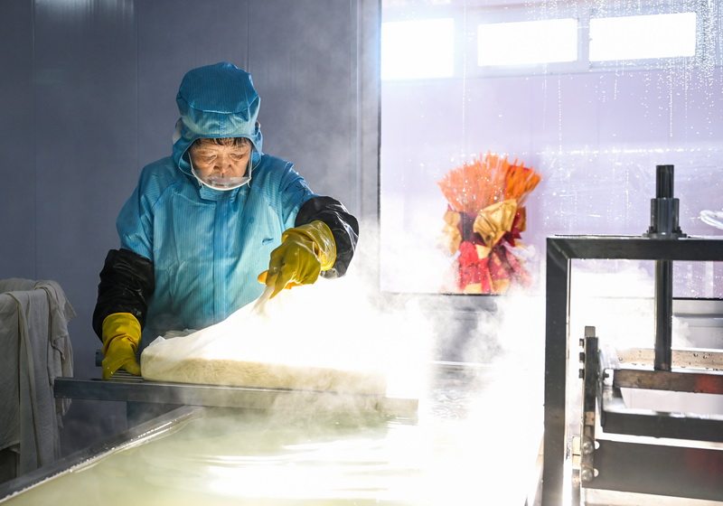 1月11日,怀安豆韵食品有限公司员工在进行豆制品加工。