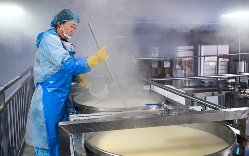 1月11日,怀安豆韵食品有限公司员工在加工豆制品。
