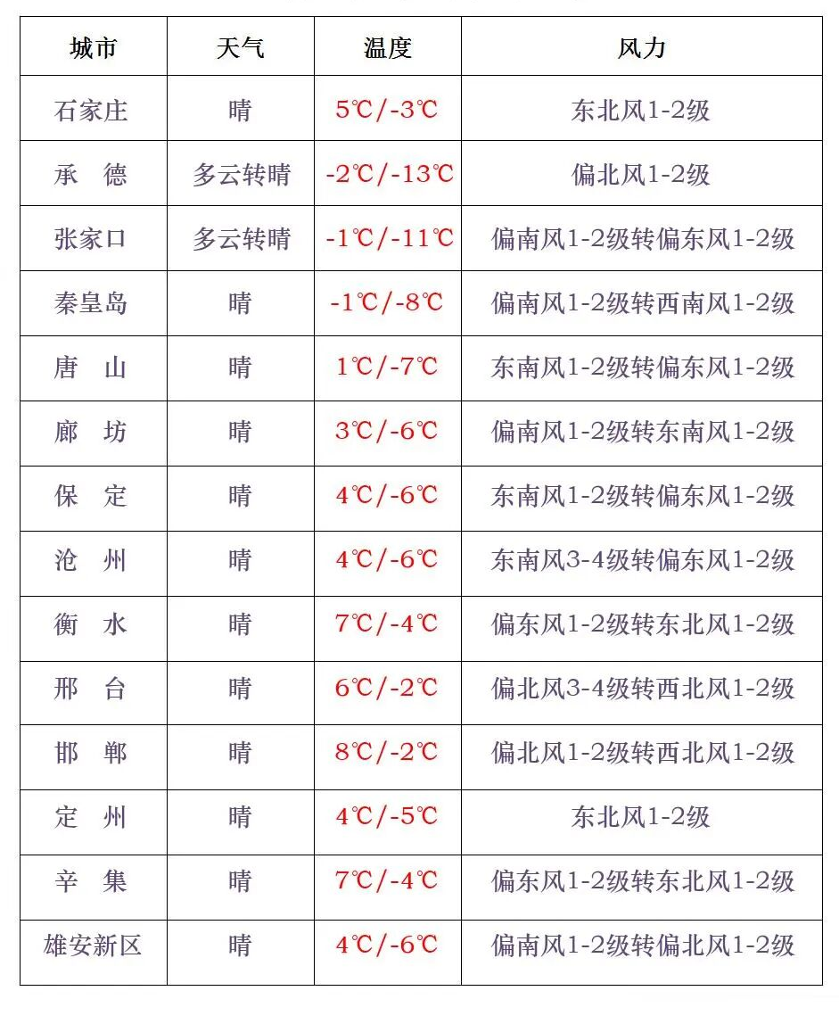 今天白天,保定、廊坊以北地区多云转晴,其中坝上地区短时阴有零星小雪或小雪,其他地区晴间多云。