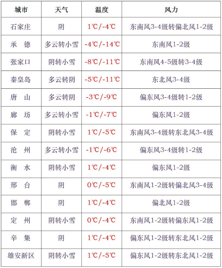 今天白天,张家口东南部、承德北部、保定西部和北部、石家庄西部多云转阴有小雪或零星小雪,其他地区多云。