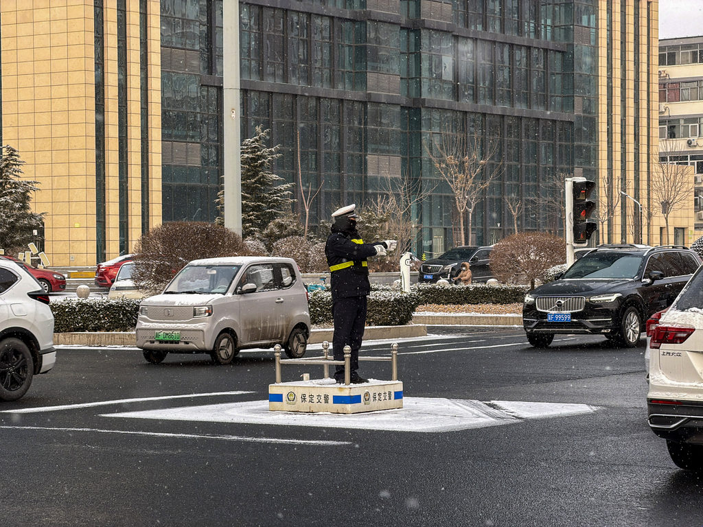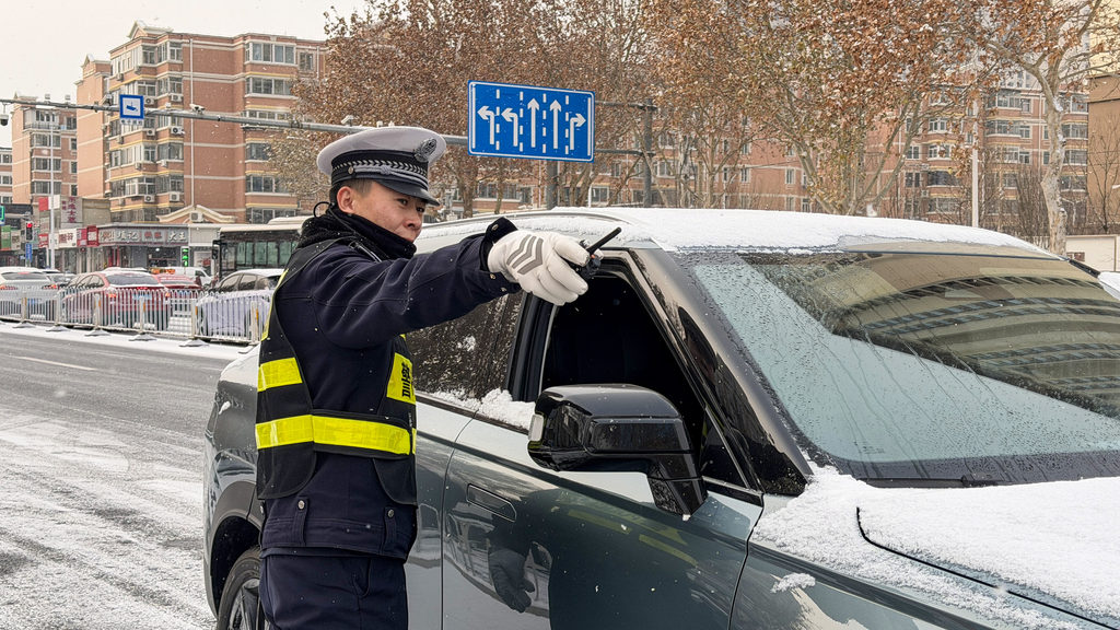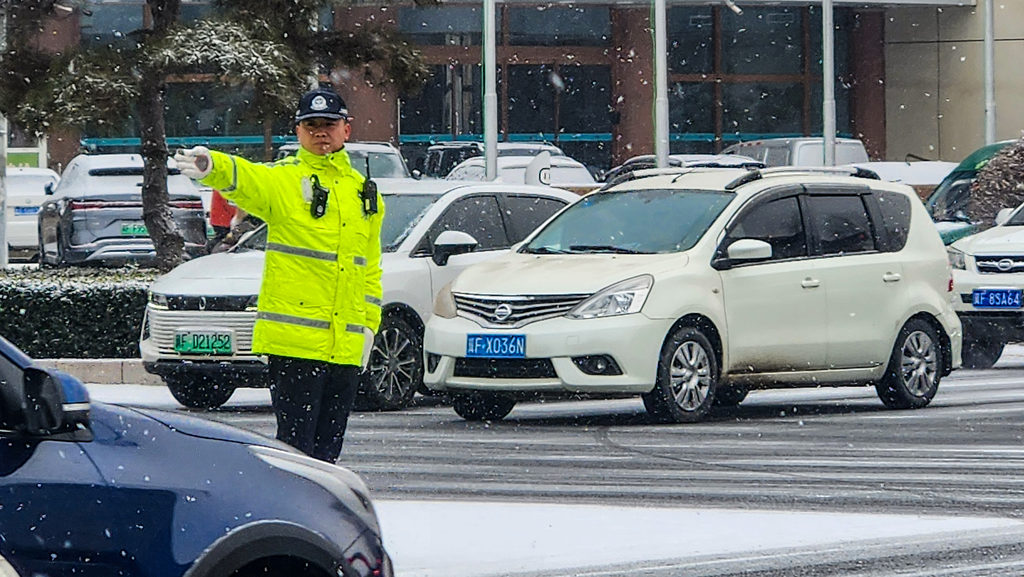 1月17日,保定市七一路与朝阳大街交口,执勤交警在冒雪指挥交通。