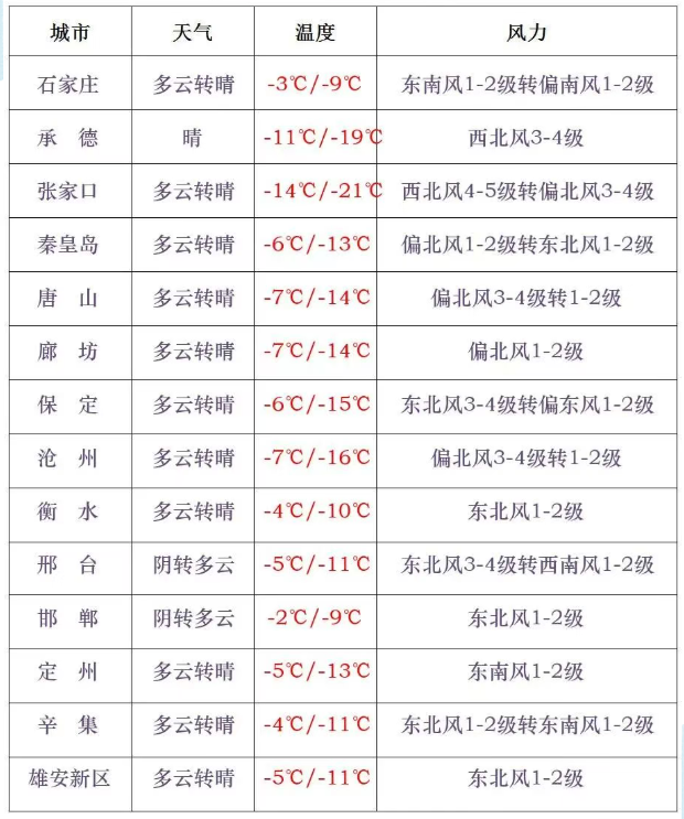 昨天(1月18日),河北气象台接连发布寒潮蓝色预警和大风蓝色预警,注意防范。今天白天,石家庄、邢台、邯郸三个地区的西部阴有零星小雪或小雪,坝上地区多云间阴,其他地区多云间晴。