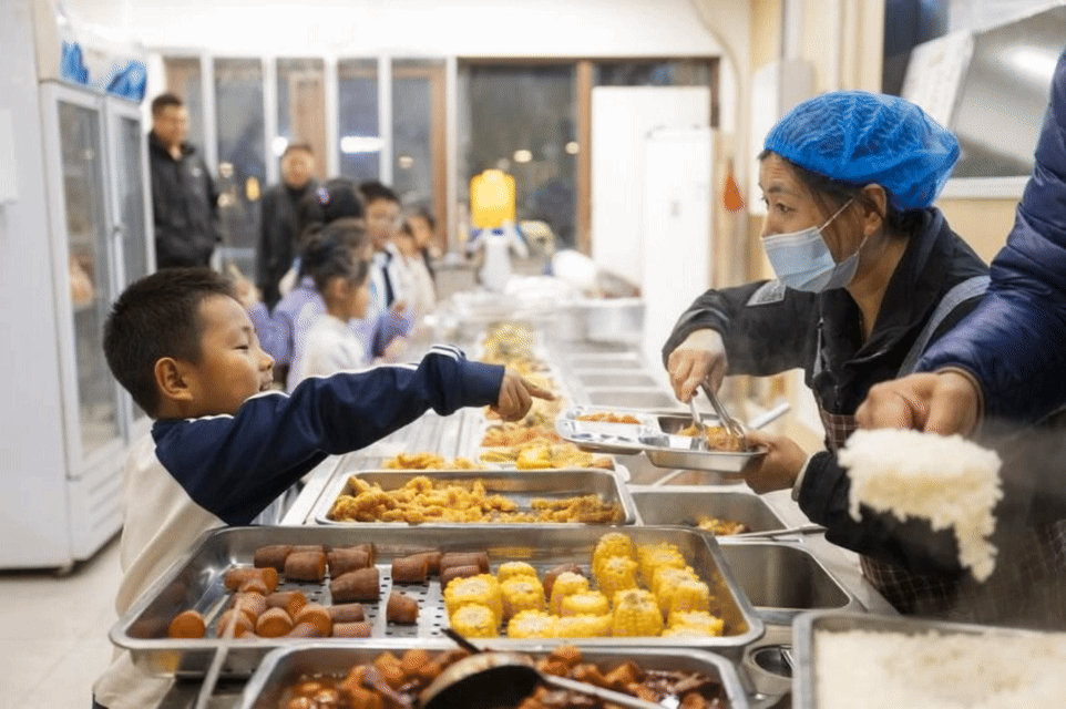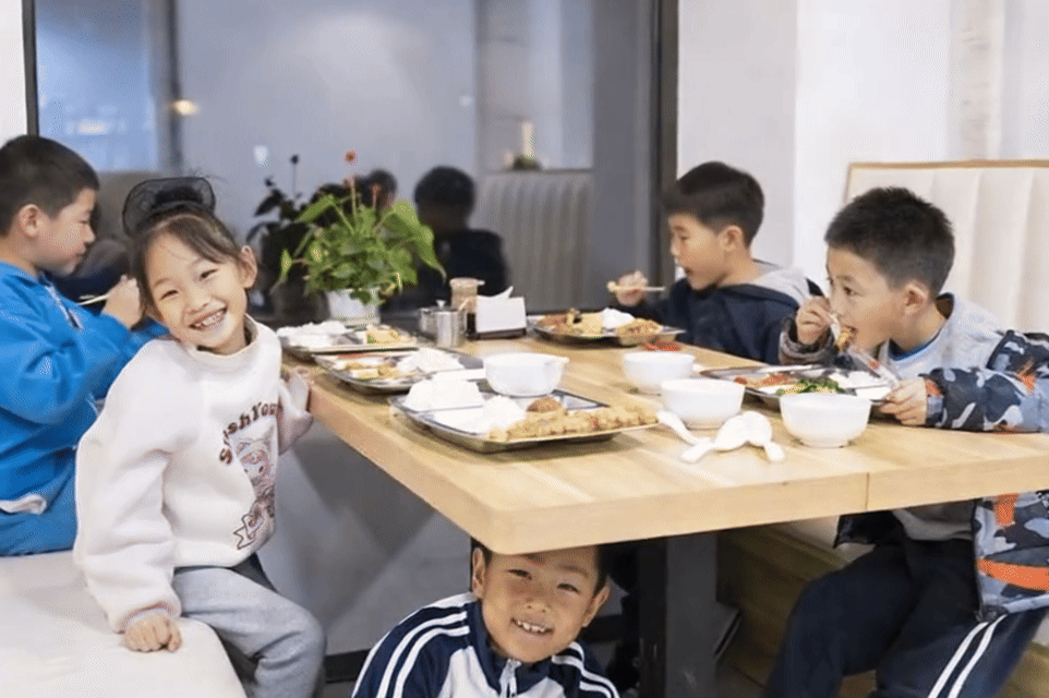 2025年11月25日,放学的小朋友在春明北社区食堂内用餐。新华社记者 伍志尊 摄
