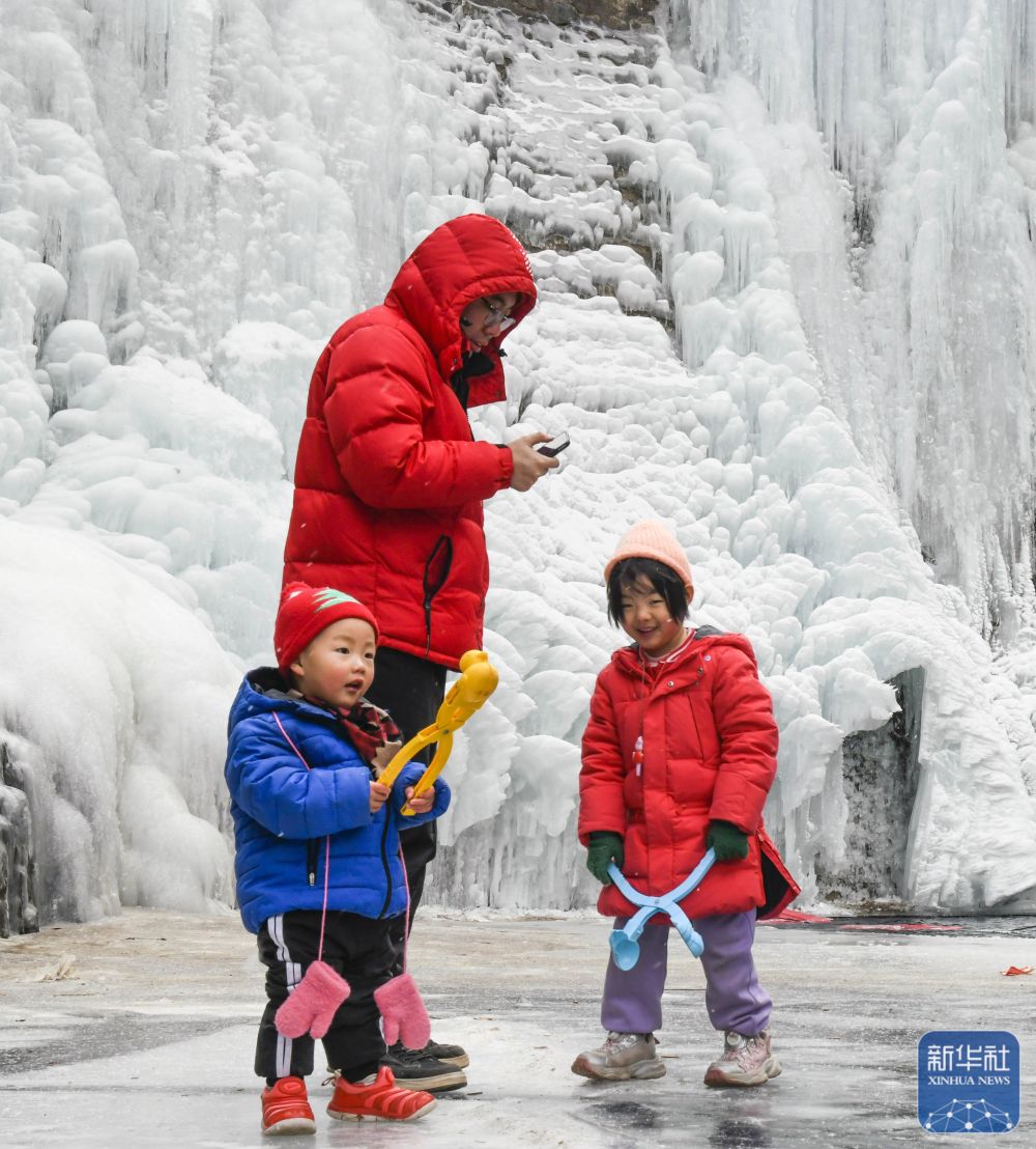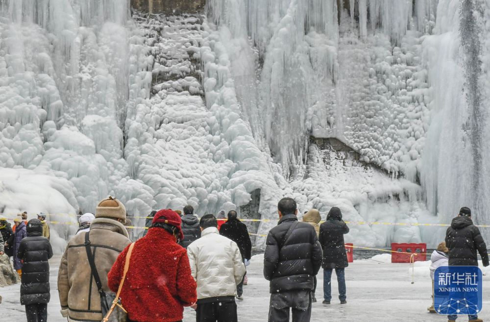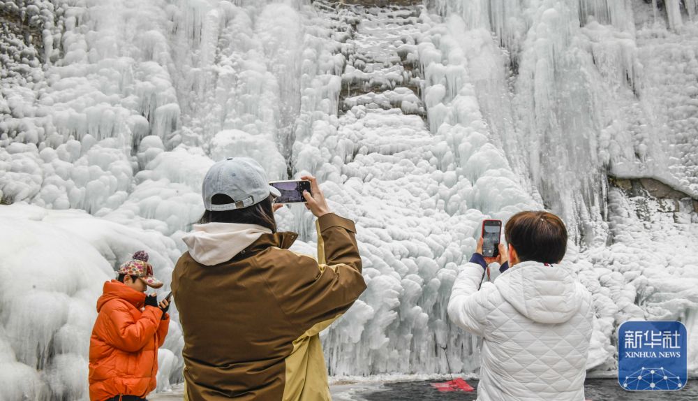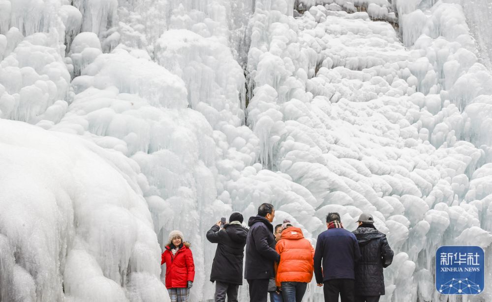 适逢周末,河北省承德市兴隆县青松岭镇石门台村附近的天然冰瀑景观吸引众多游客前来观赏游玩。