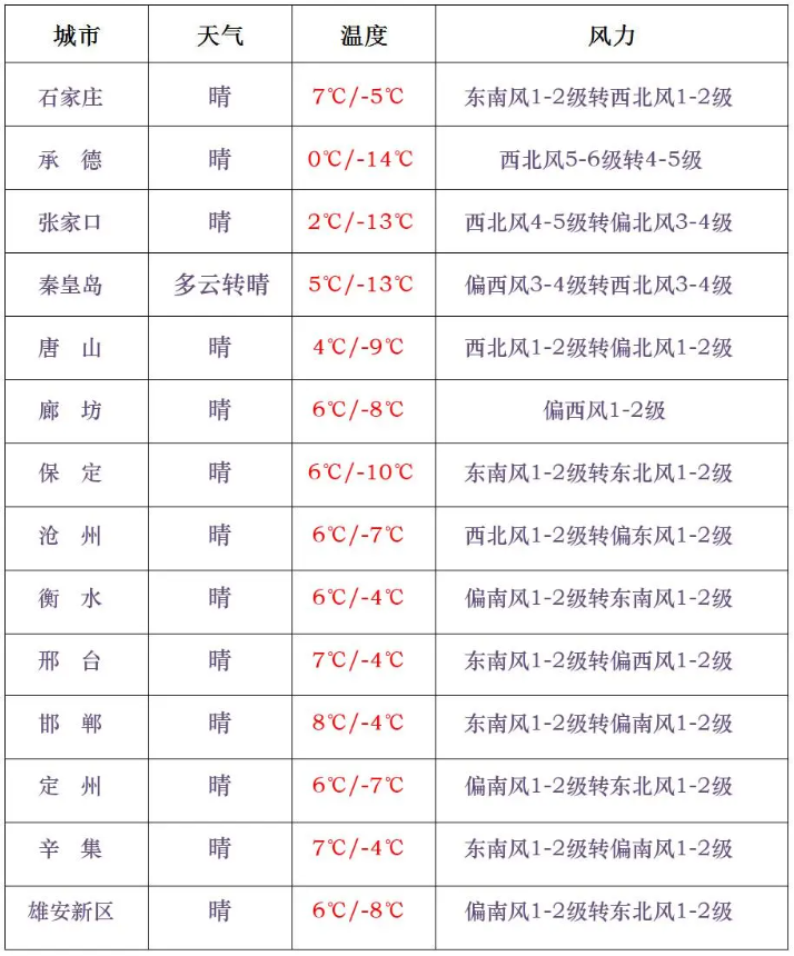 今天白天,张家口北部、承德北部、唐山、秦皇岛多云转晴,其他地区晴间多云。今天白天到夜间,张家口、承德、保定西北部有西北风4到6级,阵风7到8级,局地可达9级。