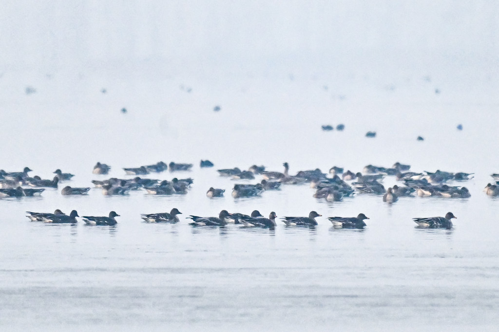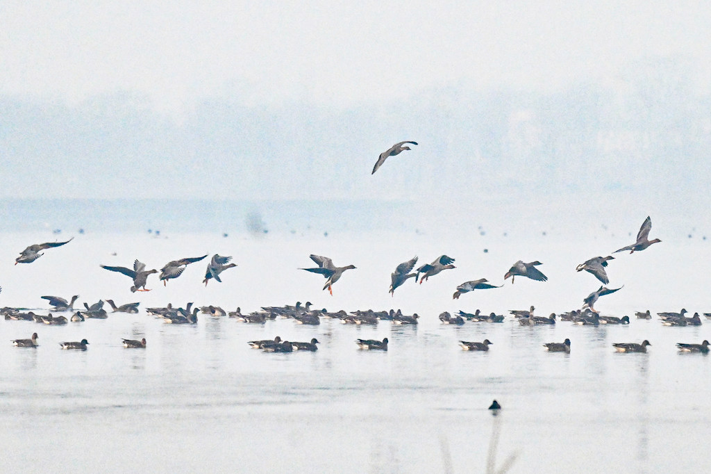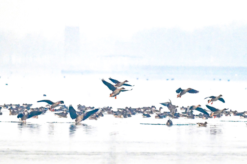1月23日,大雁在磁县溢泉湖湿地栖息。