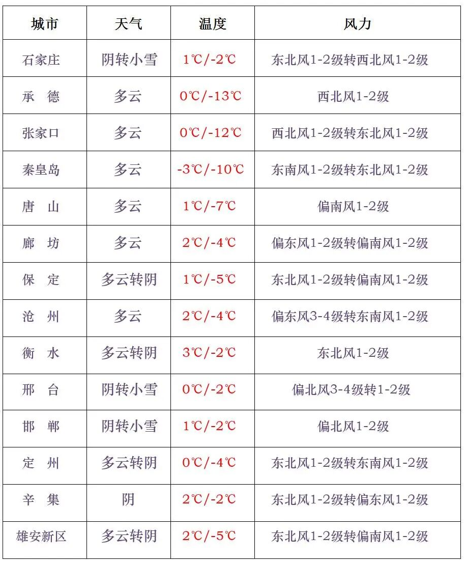 今天白天,石家庄西部、邢台西部、邯郸多云转阴,其中邢台西部、邯郸西部有小雪或零星小雪,其他地区晴转多云。