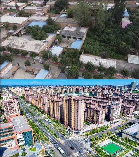 拼版照片:2021年8月,航拍镜头下的河北省容城县小里镇胜利庄村(上图);2024年6月,航拍镜头下的雄安新区容东片区街道(下图)。