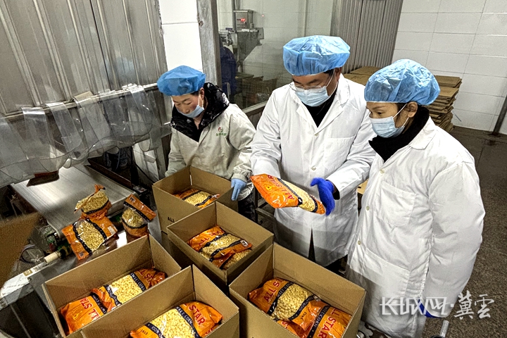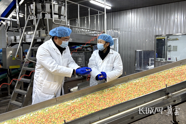 在乐亭县金田果菜有限公司,随着机器轰鸣,已经加工好的玉米粒、豌豆粒等正顺着传送带运送至包装环节。在这里,李瑶仔细观察着每一个细节并不时询问着。