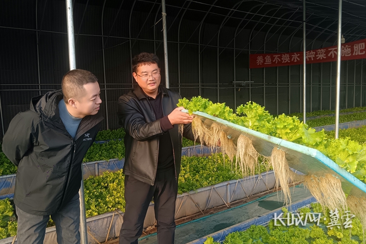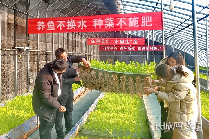 李瑶为参观人员介绍村里的“鱼菜共生”模式。