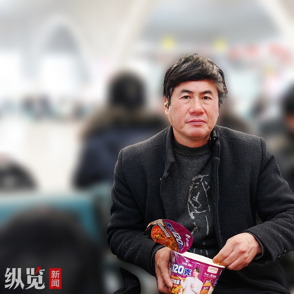 在石家庄车站候车大厅内,四川达州的唐长兵正捧着一碗泡面,和8位工友围坐在一起,边吃边用方言唠着家常。几人面前摆放的除了泡面,还有酱肉、火腿肠等,这是他们的午餐。今年48岁的唐长兵经朋友介绍,于2000年左右来到河北廊坊打工,没有想到,一干就是20多年。“我儿子就是在廊坊出生的,今年都25岁了。”唐长兵说,他在河北这边打工感觉各方面都不错,所以干了二十六七年了。今天,几人从廊坊出发,到石家庄站中转,接着会搭乘17个小时的火车,回到家乡达州。这些年,他和工友们基本是每年春节才回一次老家,待上二十多天后回到廊坊。说起过年回家,唐长兵非常激动,用他的话说“明天到家就可以见到父母和孩子,不管挣多挣少都要回家团圆。”