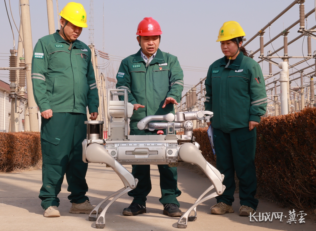 杨旭(中)向同事讲解机器人在电网智能巡检中的应用。国网廊坊供电公司 供图