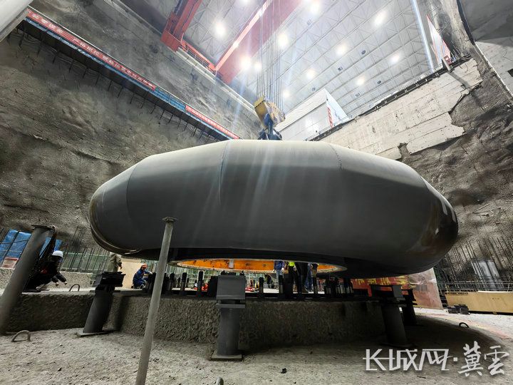 一百多吨的设备,就这样一毫米一毫米地边调整边下降。当座环中心与机组中心偏差小于3毫米时,绳索的微调已到极限,真正的“绣花功夫”开始了。在千斤顶的配合下,桥式起重机一点点释放载荷,楔形钢板慢慢贴合……“误差小于0.3毫米!停!”座环蜗壳被稳稳放置在楔形钢板上,“吊装成功!”马臣忍不住欢呼起来。