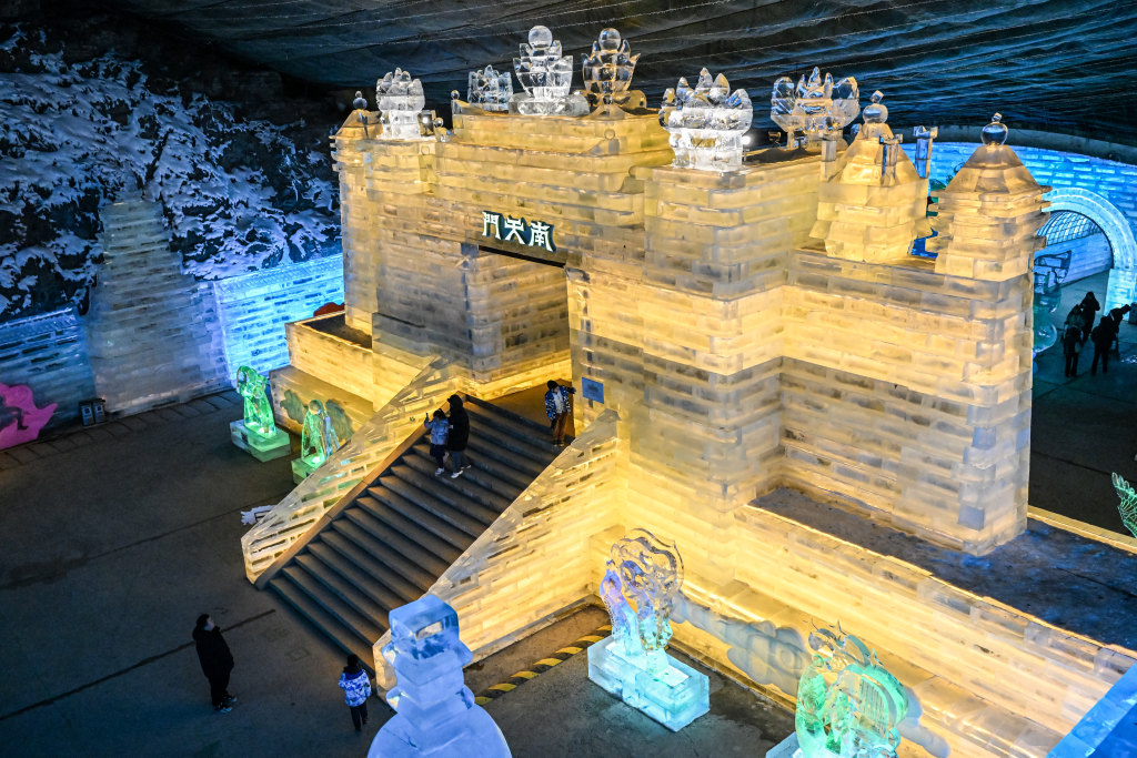 2月4日,游客在北京延庆龙庆峡冰灯艺术节展区参观。