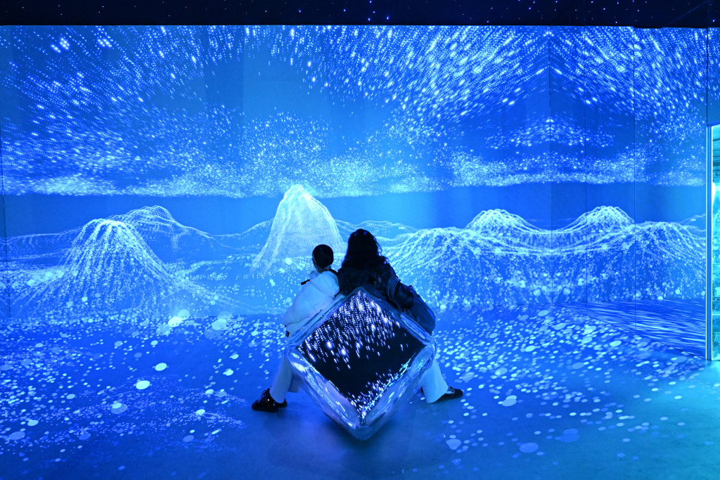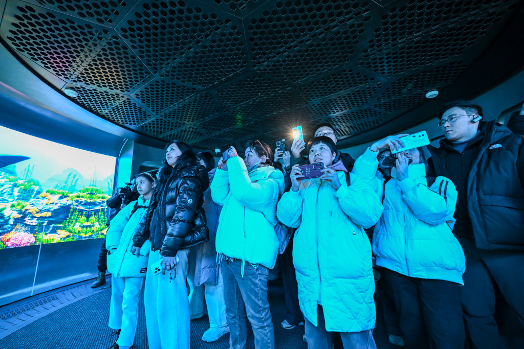 2月7日,观众乘坐“海博号”深海下潜舱通过裸眼3D技术沉浸式体验下潜千米深海。