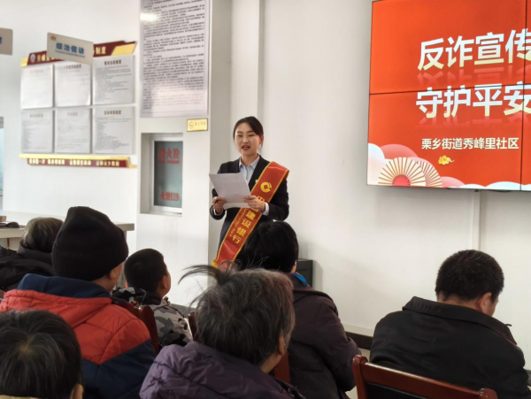 随着春节将至,万家团圆在即,电信网络诈骗也进入活跃高发期。为守护好居民群众的“钱袋子”,营造平安祥和的节日氛围,近日,唐山市迁西县栗乡街道秀峰里社区携手建设银行迁西支行,开展了春节前夕反诈宣传讲座活动,将实用的反诈知识送到居民身边、走进群众生活,切实筑牢社区节前反诈安全防线。