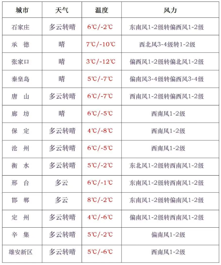 今天白天,保定、廊坊以南地区多云间晴,其他地区晴间多云。今天早晨,中南部地区最低气温下降3~6℃。