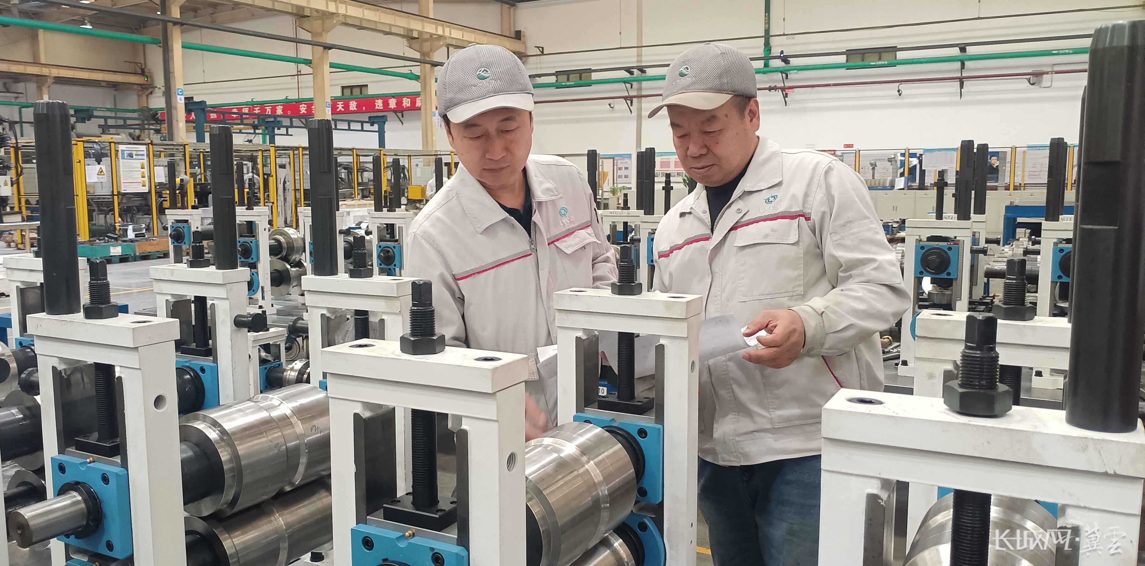 全国人大代表武春虎(左)在车间调试设备。长城网·冀云客户端记者蔡洪坡 摄