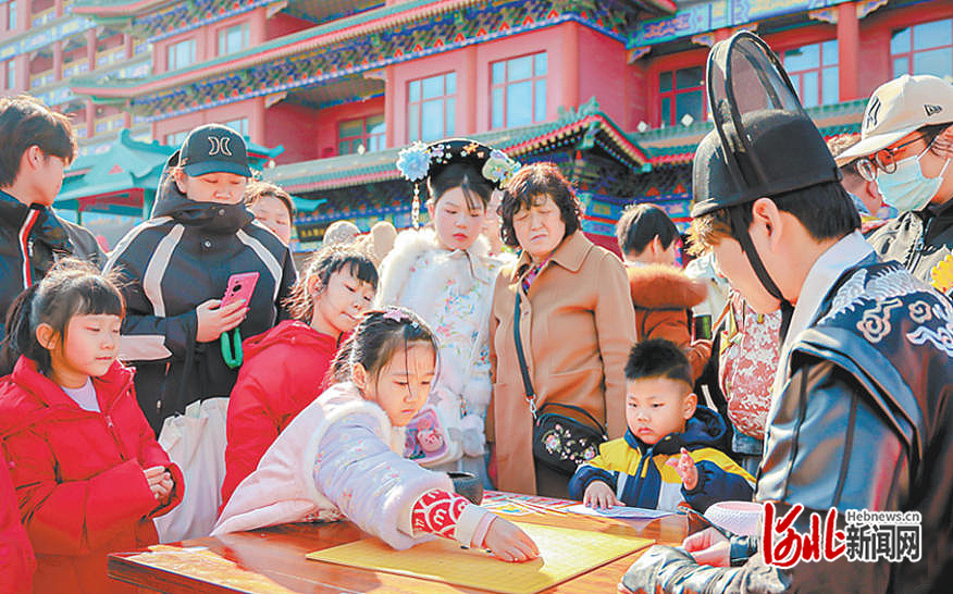 “镖局”门口,穿针引线、猜谜语等游戏摊位前游客们排起长队;永乐食街里,刚出锅的香河肉饼香气扑鼻;九州广场上,常山战鼓、黄漕飞叉等非遗轮番上演,引得游客叫好不断……