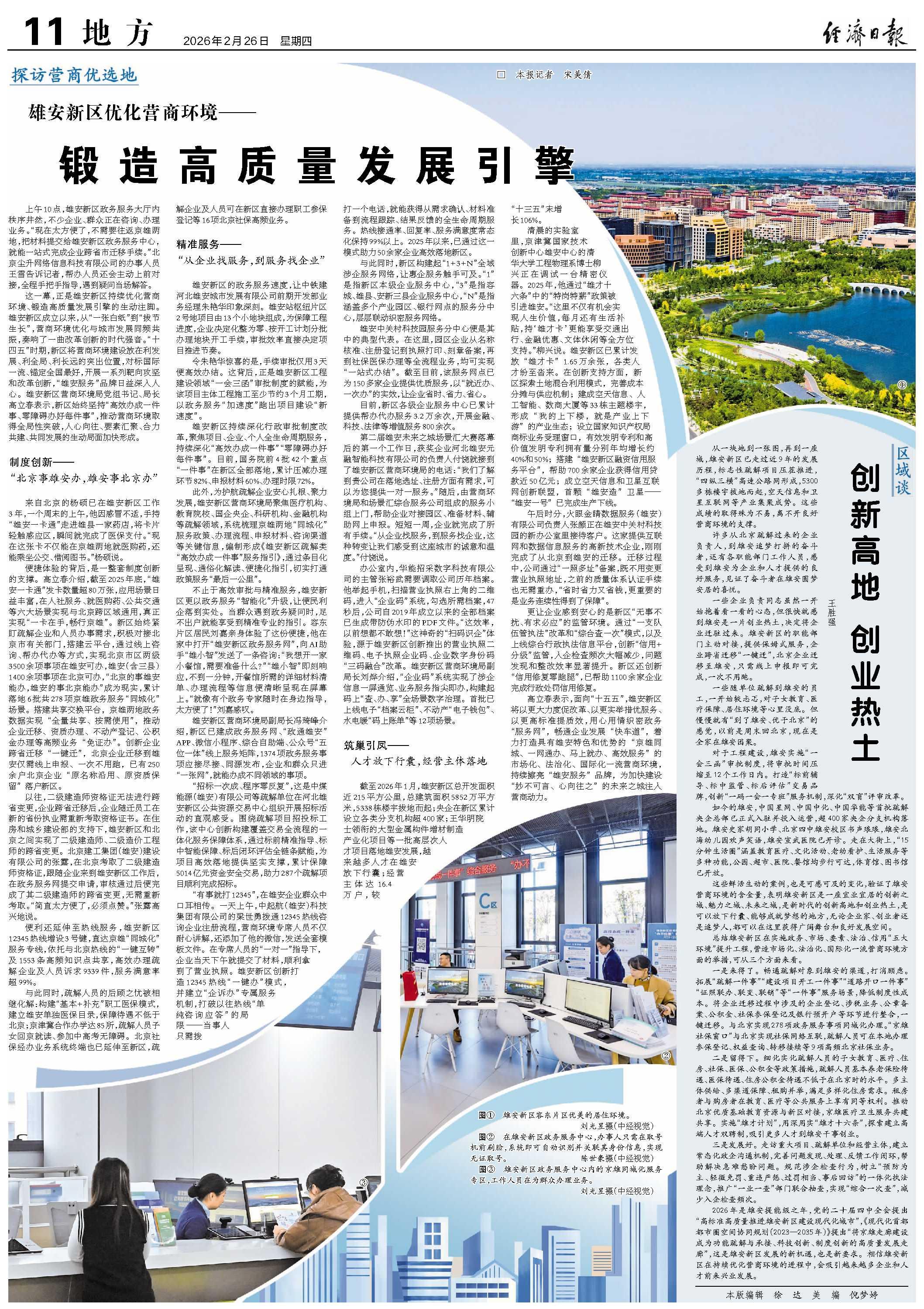 清晨的实验室里,京津冀国家技术创新中心雄安中心的清华大学工程物理系博士柳兴正在调试一台精密仪器。2025年,他通过“雄才十六条”中的“特岗特薪”政策被引进雄安。“这里不仅有机会实现人生价值,每月还有生活补贴,持‘雄才卡’更能享受交通出行、金融优惠、文体休闲等全方位支持。”柳兴说。雄安新区已累计发放“雄才卡”1.65万余张,各类人才纷至沓来。在创新支持方面,新区探索土地混合利用模式,完善成本分摊与供应机制;建成空天信息、人工智能、数商大厦等33栋主题楼宇,形成“我的上下楼,就是产业上下游”的产业生态;设立国家知识产权局商标业务受理窗口,有效发明专利和高价值发明专利拥有量分别年均增长约40%和50%;搭建“雄安新区融资信用服务平台”,帮助700余家企业获得信用贷款近50亿元;成立空天信息和卫星互联网创新联盟,首颗“雄安造”卫星——“雄安一号”已完成生产下线。