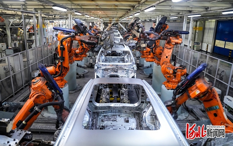 1月20日,长城汽车徐水分公司焊装车间,机器人在进行车身焊接组装。 河北日报记者 许佳奇摄