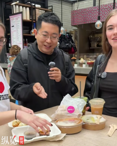 2025年8月21日,李念在英国与外国人互动并介绍中国美食。(来源/视频截图)